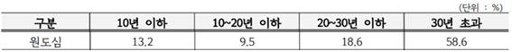 상기와 같이 하남시의 주택 유형도 크게는 아파트 비중이 60.7%를 차지하고 있다. 하지만 원도심은 거의 단독주택으로 구성되어있는데 아래의 표와 같이 원도심에서 30년이 초과 된 노후건축물은 56.8%로 상당히 노후도가 심각한 실정이다.
